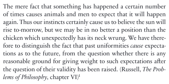 “That the sun will not rise tomorrow is no less intelligible a proposition that that it will rise. We should in vain, therefore, attempt to demonstrate its falsehood.” –Hume quoted in DIACONIS and SKYRMS (2018)