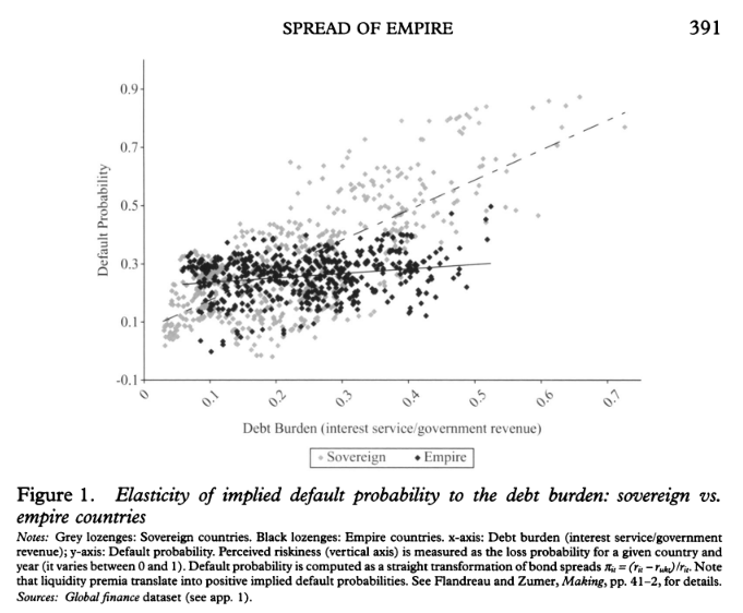 “The Empire made the spread paid by subject countries insensitive to their performance because credibility was decided elsewhere. You would not look in India for indications of India’s credit. More likely, you would look at Downing Street. The effect of empire was not to provide subjects with a marginal interest rate benefit but to remove the default risk altogether.”