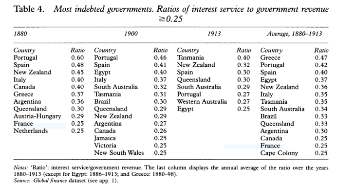 “There are only three borrowers in our sample which became (de facto or de jure) colonies within the period: Egypt in 1882, and the Transvaal and the Orange Free State after the Boer War in 1900.”