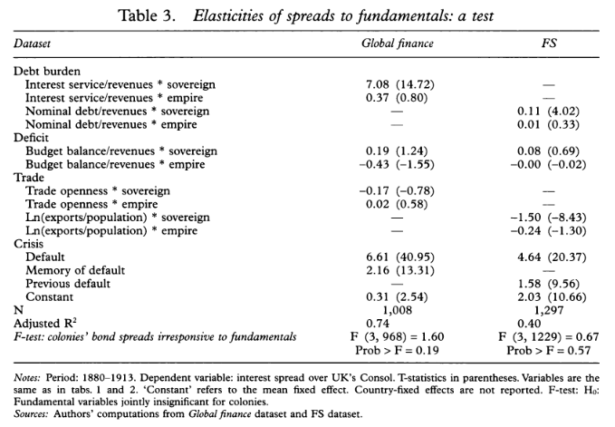“…it is assumed that investors thought of British colonies in essentially the same way as they thought of sovereign countries; that is, they priced them according to the very same formula, involving the same variables. Then in a second stage, investors applied a bonus and traded colonies at a higher price… The second stage reduction in interest rates is the so-called ‘empire effect’, and it is measured ‘other things being equal’.”