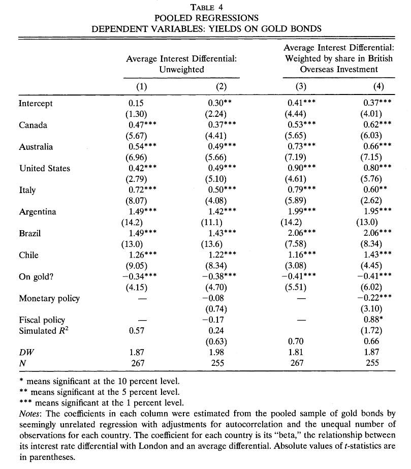 Their hypothesis: adherence to the gold standard was a credible commitment device that reduced borrowing costs