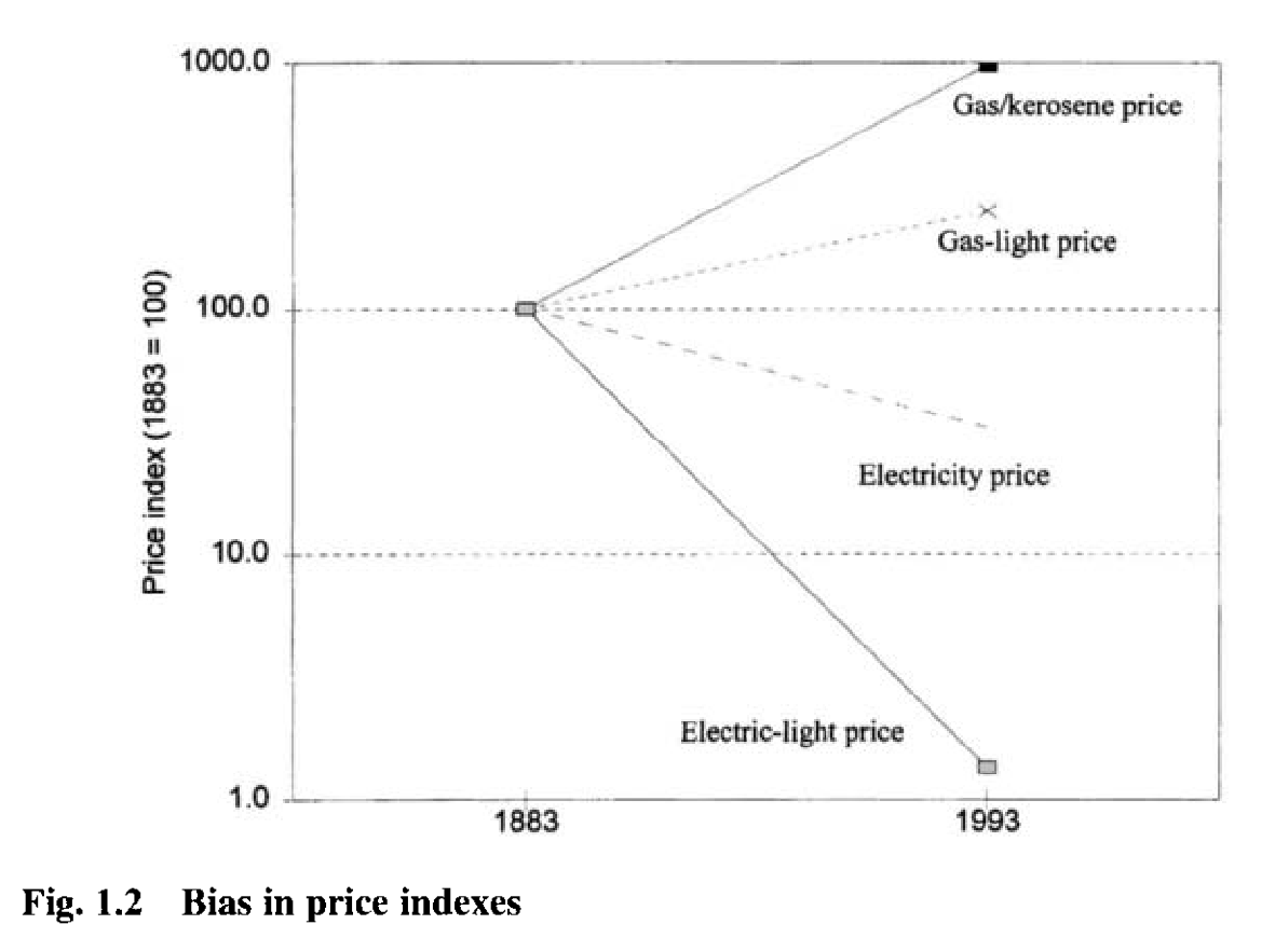 The key insight: as technology changes (candles → gas → electricity → LEDs), traditional price indices track a shifting set of goods; Nordhaus tracks a fixed service