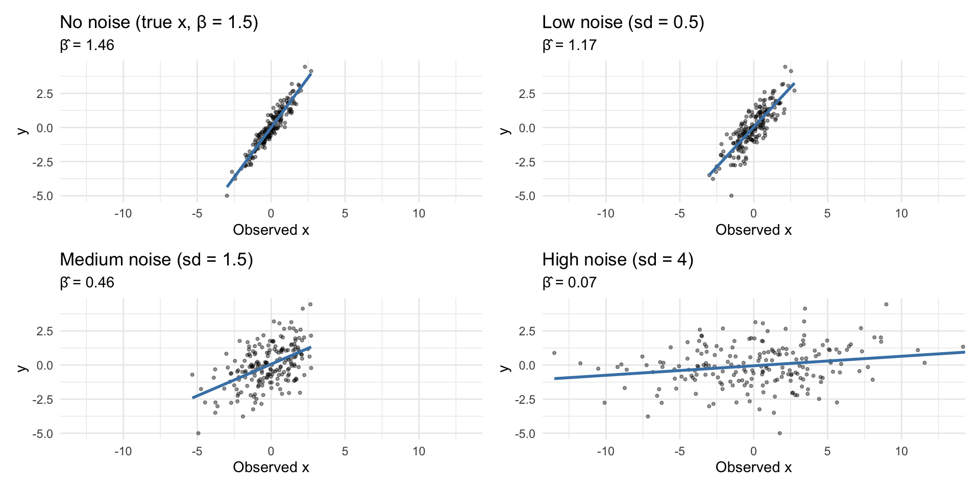 True model: \(y_i = \alpha + \beta x^*_i + \epsilon_i\), but we observe \(x_i = x^*_i + u_i\)